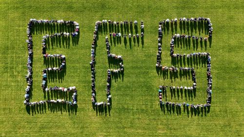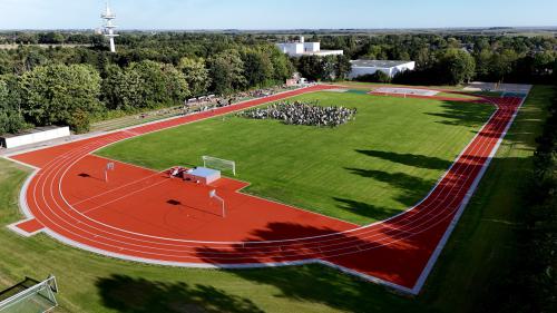 Wie es sich für eine Sportstätte gehört, wurde in Teamarbeit aller Schüler zunächst das Kürzel der Eilun Feer Skuul auf dem Rasen geformt und anschließend eine kleine Choreographie gezeigt, die die Fachschaft Sport bereits in den Sommerferien geplant hatte.