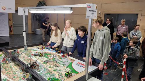 „Also hier startet er“, erklärt ein junger Schüler voller Eifer und lässt den Roboter alias Multifunktionsfahrzeug mit diversen auswechselbaren Hebeln seine Runde abfahren. An einzelnen Stationen müssen unterschiedliche Aufgaben erfüllt werden, die von den Robot-Game-Regeln vorgegeben werden. Abstands-Sensoren am Gefährt garantieren, dass der Roboter „in der Spur“ bleibt.